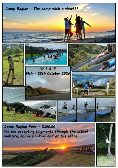 We have two separate camp facilities this year. Our Year 5 & 6 students will attend Carey Park Camp, and our Year 7 & 8’s will attend Camp Raglan.
